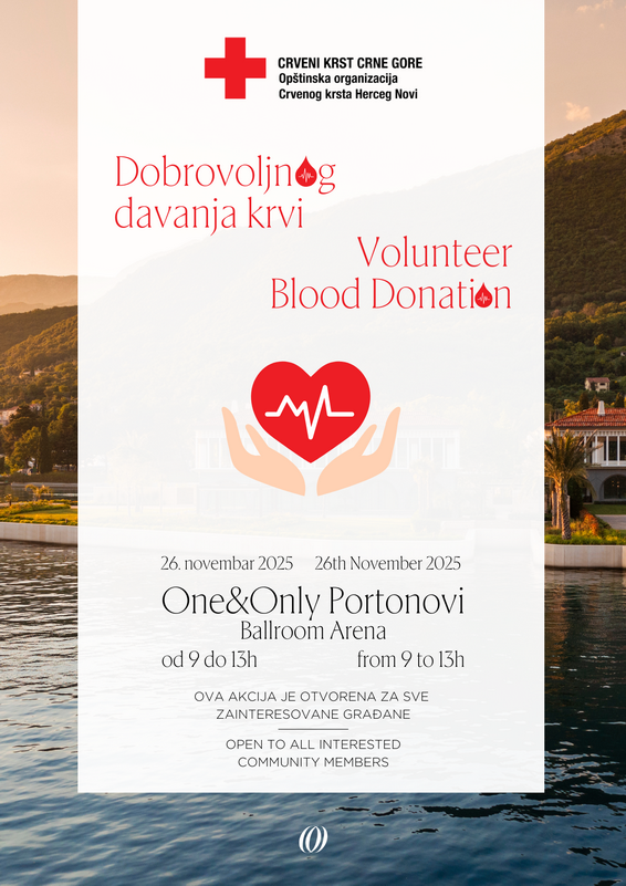 One&Only Portonovi će u srijedu 26. novembra 2025. godine održati dobrovoljnu akciju davanja krvi, organizovanu u saradnji sa Crvenim krstom Crne Gore, Opštinskom organizacijom Herceg Novi. Ovaj humani događaj biće održan u svečanoj sali hotela (Ballroom Arena), u periodu od 9 do 13 časova, i otvoren je za sve zainteresovane članove zajednice koji žele da doprinesu ovoj važnoj inicijativi.