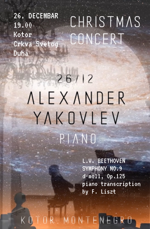 Ugledni ruski pijanista Aleksandar Jakovljev nastupiće drugog dana Božića, u petak, 26. decembra od 19 sati, u Koncertnoj dvorani Muzičke škole „Vida Matjan“ u Kotoru – Crkvi Sv. Duha. U programu je Simfonija br. 9 u d-molu, Op.125 Ludviga van Betovena, u klavirskoj transkripciji Franca Lista.