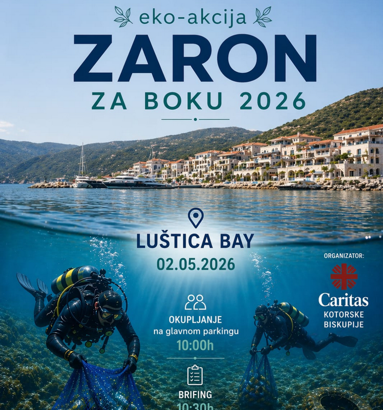 Caritas Kotorske biskupije najavljuje veliku ekološku inicijativu pod nazivom „Zaron za Boku 2026“, koja će se održati 1. i 2. maja. Akcija će okupiti oko 80 sertifikovanih ronilaca i volontera iz Crne Gore i regiona, ujedinjenih u zajedničkoj misiji očuvanja prirodnih ljepota našeg zaliva.