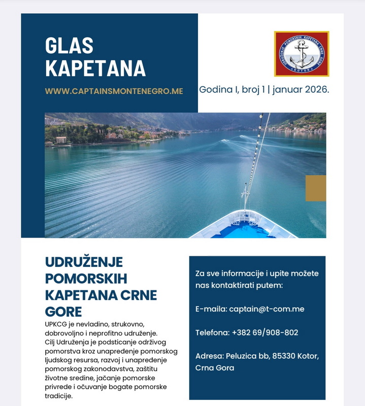 “Newsletter pod nazivom „Glas kapetana“ izlaziće četiri puta godišnje, za sada isključivo u elektronskoj formi, a Upravni odbor Udruženja ujedno čini i uređivački odbor,” kaže za naš radio novi predsjednik organizacije i inicijator pokretanja publikacije društva, kapetan Ivo Fažo iz Tivta, koji naglašava da su svi članovi pozvani da predlažu ideje i teme za naredna izdanja.
