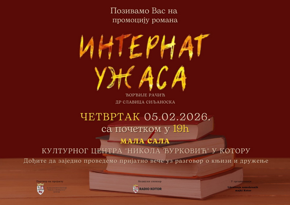 Profesor Đorđije Đoko Račić i Slavica Siljanoska iz Kotora autori su romana „Internat užasa“, koji će biti predstavljen u četvrtak, 5. februara od 19 sati u Kulturnom centru „Nikola Đurković“ u Kotoru, u organizaciji Udruženja samohranih majki Kotor.
