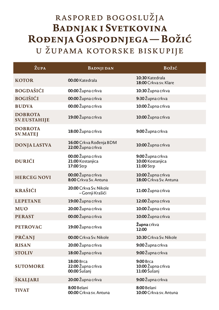 Iz Biskupskog ordinarijata Kotor obavještavaju da će svete mise biti služene prema sledećem rasporedu.