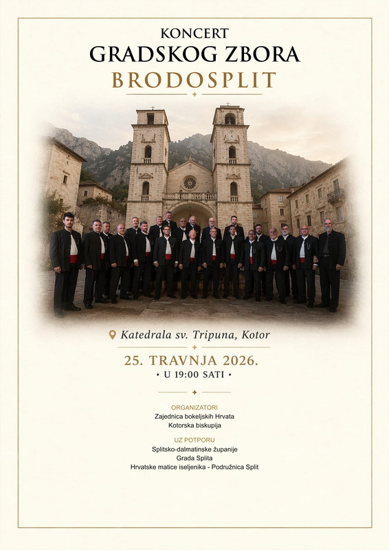 Zajednica bokeljskih Hrvata (Republika Hrvatska) organizira koncert Gradskog zbora Brodosplit pod ravnanjem maestra Vlade Sunka koji će se povodom blagdana bl. Ozane održati u Kotoru u katedrali sv. Tripuna, 25. aprila 2026. s početkom u 19 sati. Koncertu prethodi sveta misa u 18 h, u crkvi Sv. Marije od rijeke (Koleđati). Na repertoaru je sakralna glazba skladatelja kao što su de Victoria, Mendelssohn, Papandopulo, Stipišić-Delmata, Sunko.