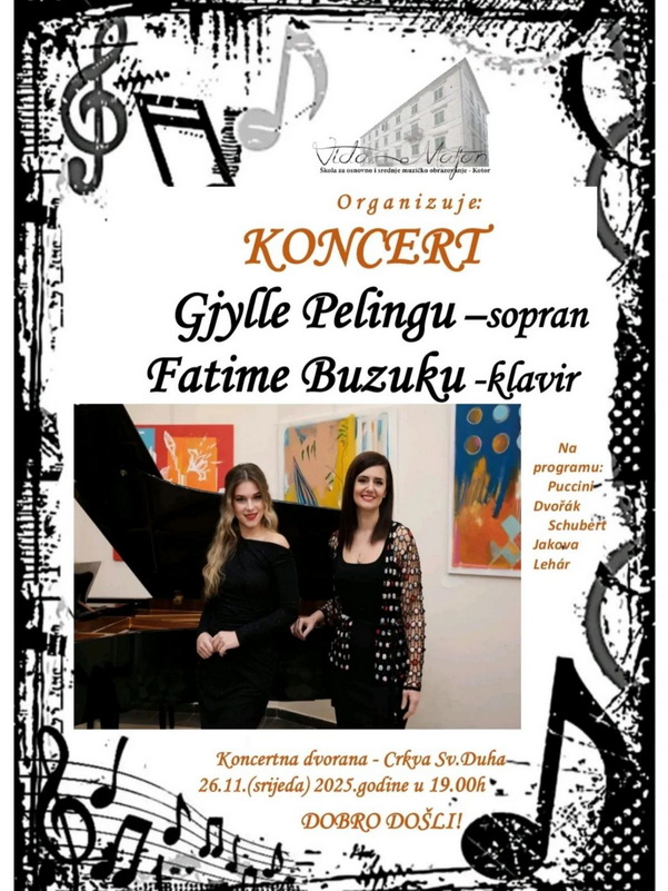 Kamerni duo Gjylie Pelingu – sopran i Fatime Buzuku– klavir, nastupiće prvi put u Kotoru večeras, srijeda, 26. novembra, od 19 sati u Koncertnoj dvorani Muzičke škole “Vida Matjan”- Crkvi Sv. Duha. U programu su djela Đakoma Pućinija, Antonjina Dvoržaka, Franca Šuberta, Franca Lehara, kao i djelo Prenka Jakove, istaknutog albanskog kompozitora.
