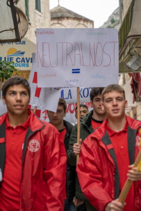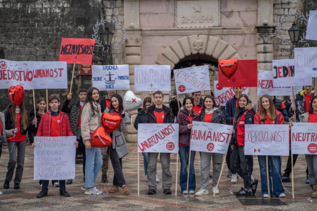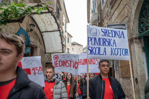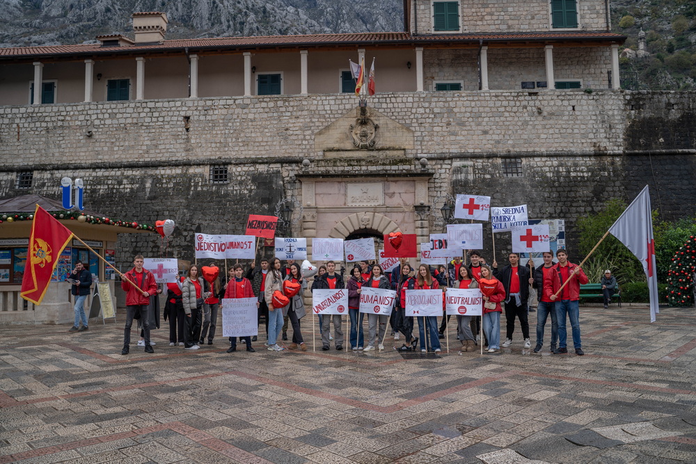 Učenici Srednje pomorske škole Kotor sa profesorkom Natašom Stojanović i ŠOSMO ,,Vida Matjan”, sa pedagoškinjom Milkom Matković napravili su “đir” kroz Stari grad, noseći transparente sa ispisanim principima Crvenoga krsta, kojih ima sedam: humanost, nepristrasnost, neutralnost, nezavisnost, dobrovoljnost i univerzalnost. Ovi principi, objašnjava nam Vasilije Ševaljević, predsjednik omladine i Kluba mladih Opštinske organizacije Crveni krst, potiču iz čuvene rečenice “Tutti fratelli˝ (Svi smo braća) koju je rekao Anri Dinan osnivač Crvenog krsta, vidjevši ranjenike i mrtve na bojnom polju blizu Solferina,1859.g. Ovaj slogan govori da pružanje pomoći ne poznaje bilo kakve podjele.