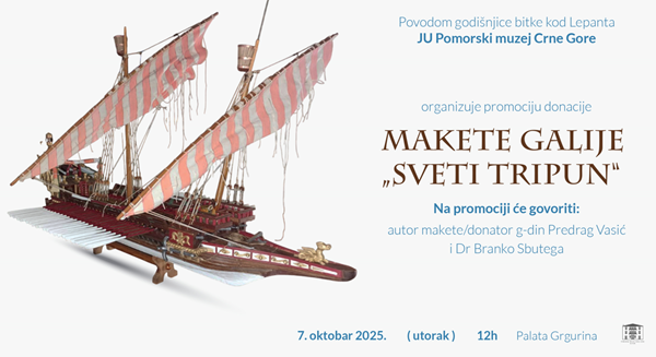 Povodom godišnjice bitke kod Lepanta JU Pomorski muzej Crne Gore organizuje promociju donacije makete galije „Sveti Tripun“.