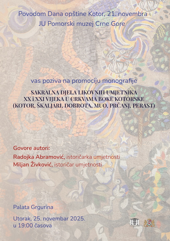 Povodom Dana opštine Kotor 21. novembra, Javna ustanova Pomorski muzej Crne Gore Kotor organizuje promociju monografije “Sakralna djela likovnih umjetnika XX i XXI vijeka u crkvama Boke Kotorske (Kotor, Škaljari, Dobrota, Muo, Prčanj, Perast)” u utorak, 25. novembra, sa početkom u 19 sati.