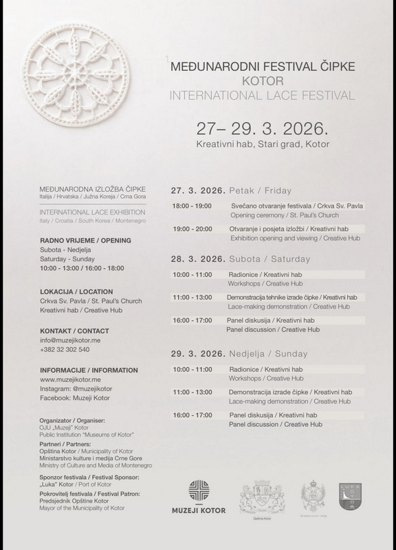 Kotor je domaćin Međunarodnog festivala čipke, koji će se održati od 27. do 29. marta 2026. godine u organizaciji OJU „Muzeji” Kotor okupljajući učesnice i stručnjakinje iz Italije, Hrvatske, Južne Koreje i Crne Gore.