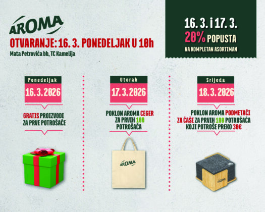 Nova Aroma donosi sve ono što volite – bogat izbor domaćih i stranih proizvoda, uvijek svježe pecivo iz samouslužne pekare i kvalitetno meso iz Domaće mesare. Obnovljeni market osmišljen je tako da prati navike kupaca i učini kupovinu jednostavnijom, bržom i prijatnijom. Novi raspored prodajnog prostora omogućava lakšu navigaciju kroz prodavnicu, bolju preglednost asortimana i ugodniji boravak u prostoru, dok modernizovan ambijent donosi potpuno novo iskustvo kupovine na poznatoj adresi.