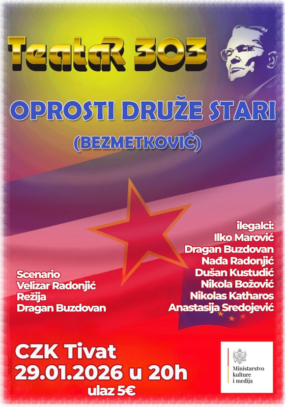 Teatar 303 u Tivtu 29. januara sa predstavom “Oprosti druže stari”Nakon Kotora i Podgorice nova predstava Teatra 303   “OPROSTI DRUŽE STARI” (BEZMETKOVIĆ) će biti izvedena u Centru za kulturu – Tivat, dana 29.01.2026. sa početkom u 20h. Cijena ulaznice je 5 €.