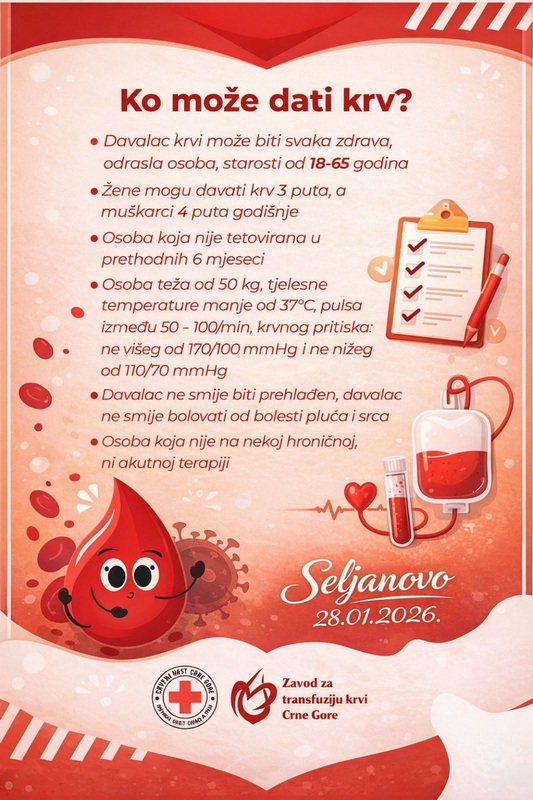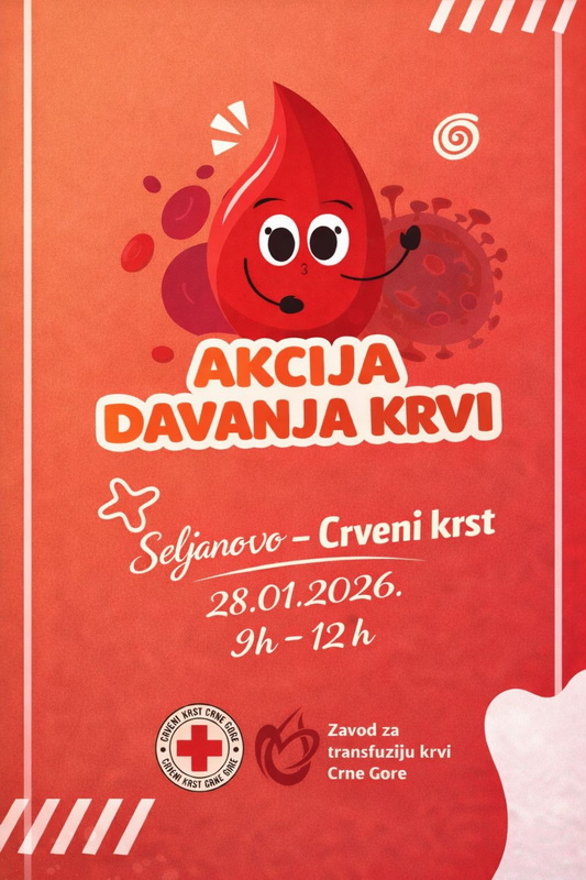 Opštinska organizacija Crvenog krsta Tivat, u saradnji sa Zavodom za transfuziju krvi Crne Gore, organizuje akciju dobrovoljnog davanja krvi koja će se održati: