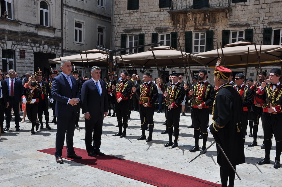 Milanović i Đukanović su na trgu ispred katedrale Svetog Tripuna obavili smotru počasnog odreda Bokeljske mornarice čiji su pripadnici potom odigrali tradicionalno Bokeljsko kolo.
